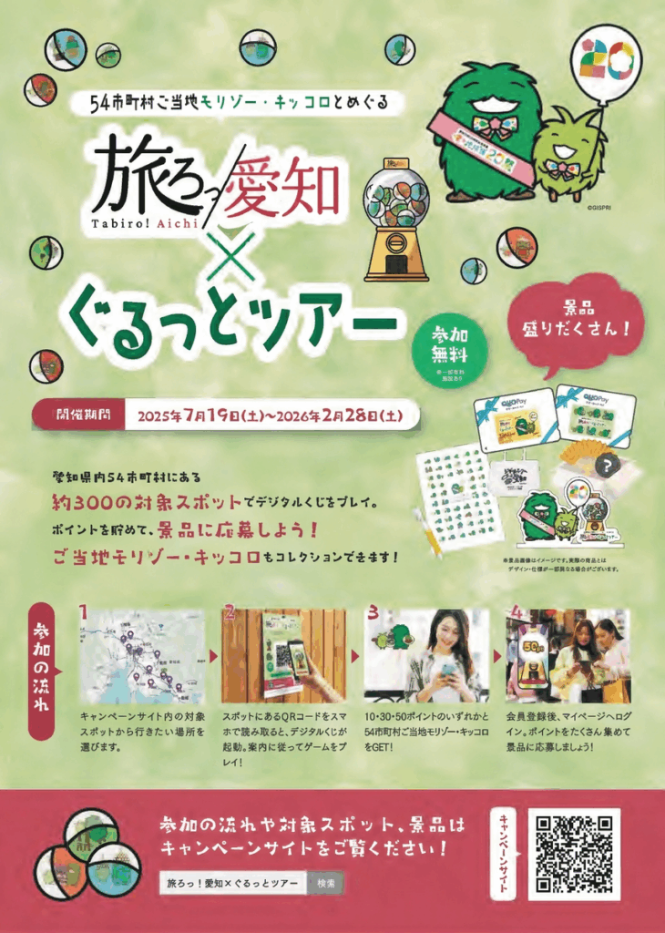 この夏から来年の冬にかけて、愛知県全域を舞台にした新しい観光スタンプラリー「旅ろっ!愛知×ぐるっとツアー」がスタートしました!開催期間は2025年7月19日から2026年2月28日まで。県内54市町村・約300スポットをめぐり、スマホでQRコードを読み取るだけで、ポイントが貯まったり、愛知県限定の「ご当地モリゾー&キッコロ」が集められたりする、旅好き&キャラ好きにはたまらないキャンペーンです。