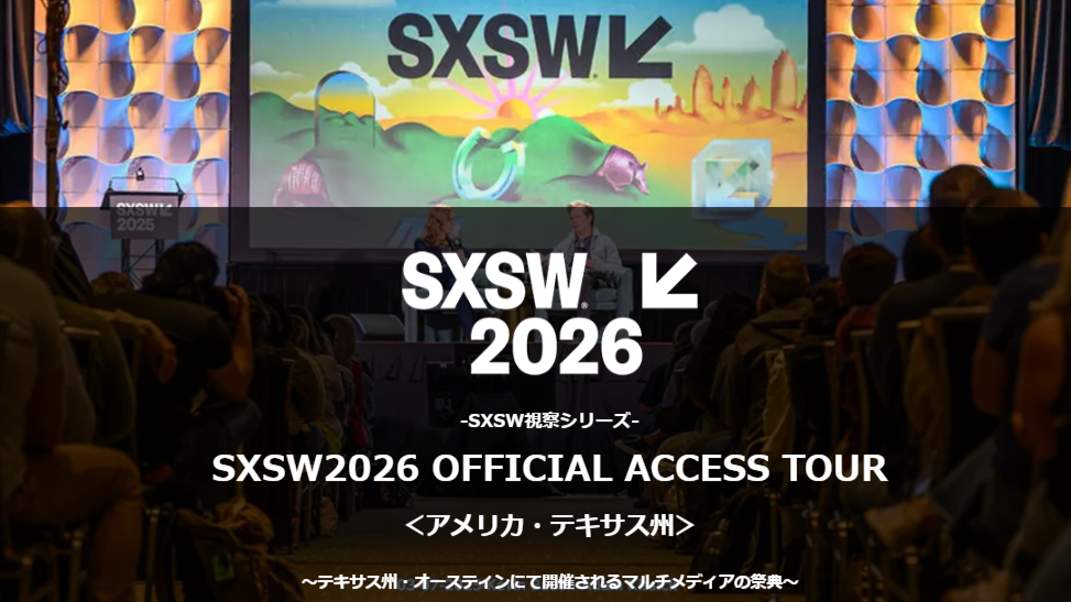 SXSW 2026 は、アメリカ・オースティンで開催される、テクノロジー、デザイン、エンターテインメントを横断した国際的なイベントです。AIやデジタル体験、クリエイティブ分野の最新トレンドに加え、社会やビジネスとの関わりをテーマにしたセッションが数多く予定されています。公式ツアーでは、SXSWの多彩なプログラムを効率よく体験できる構成となっており、世界の最新動向を知る機会です!
